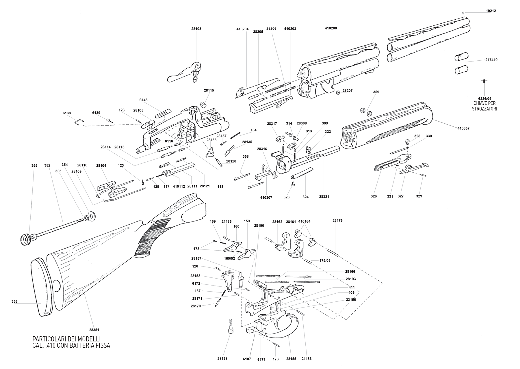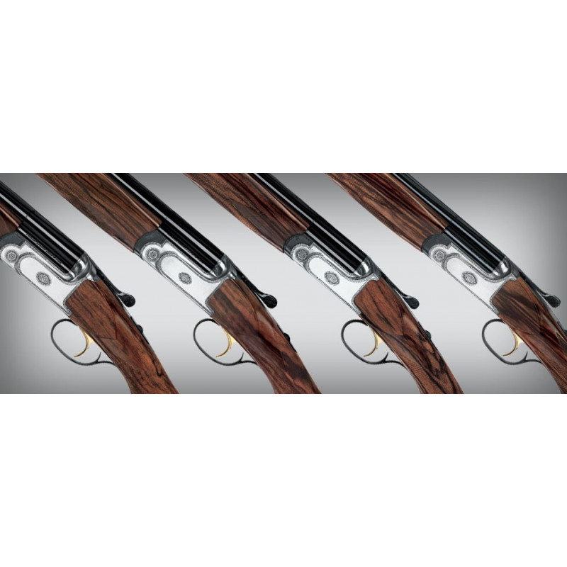 Calibres 12, 20, 28 y 410. Grado de madera sc2. Batería fija, muelles en espiral, culata (a medida) y banda fija, choques fijos, selector. Choques intercambiables con cargo extra, otros suplementos consultar.