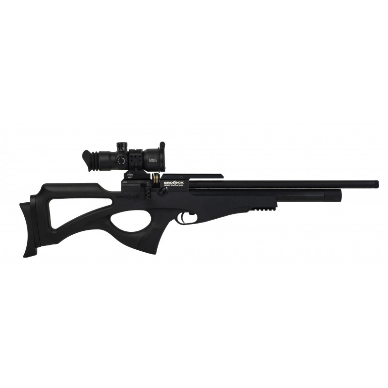 Incorpora cargador rotativo de 10 disparos y adaptador monotiro, seguro de dos posiciones, válvula auto-regulable y regulación de tres potencias (baja, media y alta).