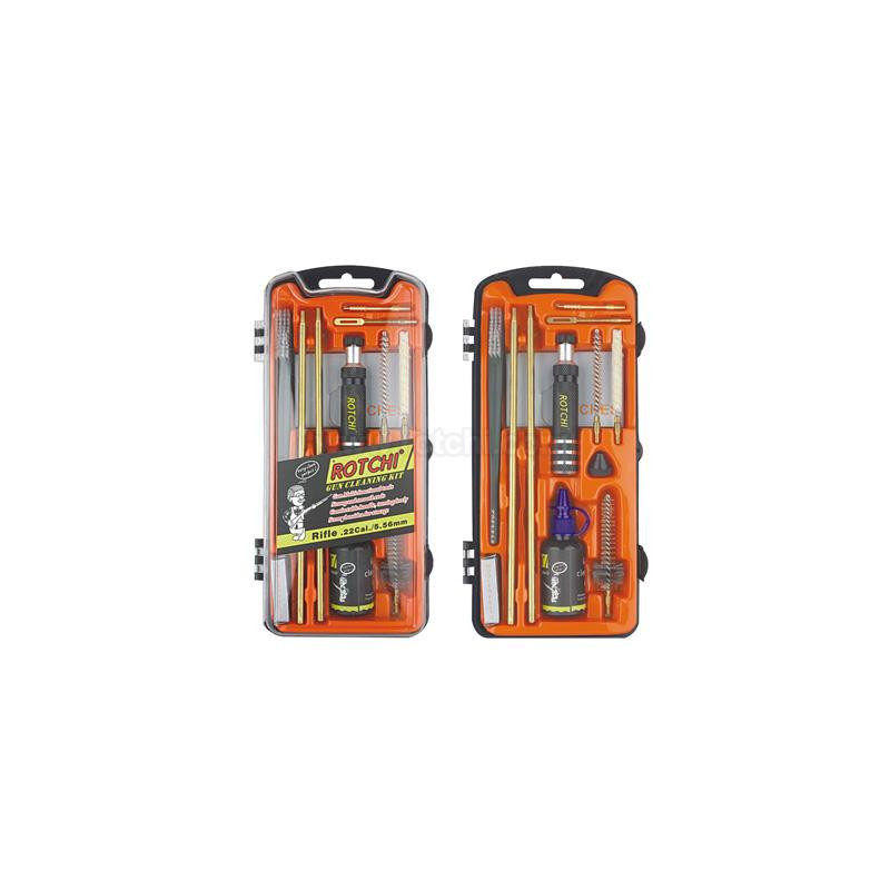Kit limpiador para rifle Rotchi que incluye 5 varillas, agarre, limpiador bronce, mopa algodón, cepillo con resorte, cepillo utilitario, porta piezas, protector boca, botella aceite vacía, caja para piezas y adaptador