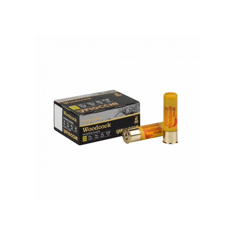 Cartucho Fiocchi BECADA CAL.20 (WOODCOCK CAL.20) con carga de 28 gramos y calibre 20/70/16. Perdigón 7#10