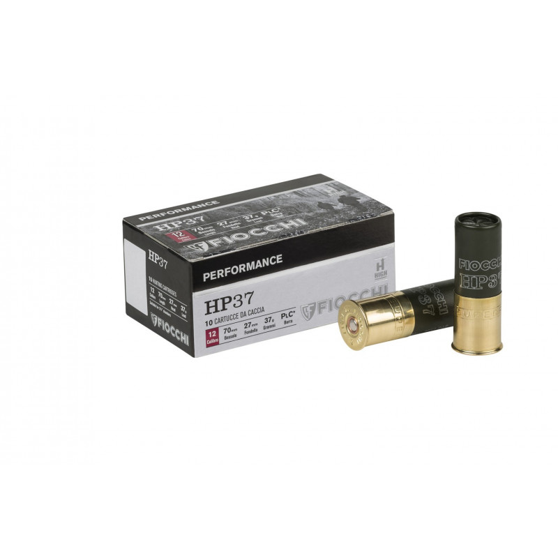 Cartucho Fiocchi HP 37 con carga de 37 gramos y calibre 12/70/27. Perdigón 0-3#7.