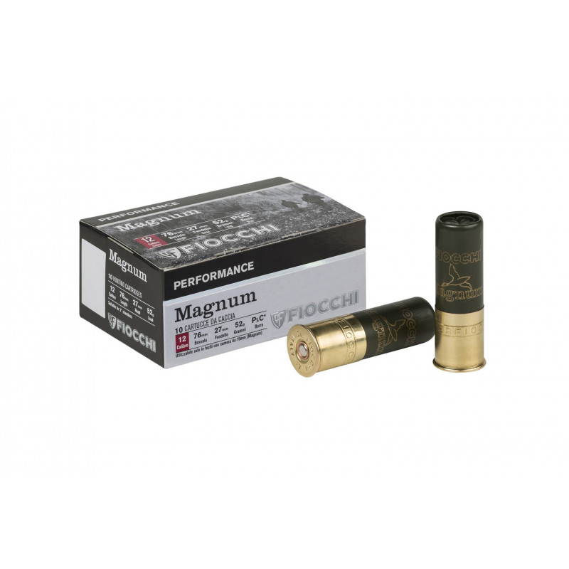 Cartucho Fiocchi MAGNUM con carga de 52 gramos y calibre 12/76/27. Perdigón 0-2#8 2/0 4/0.