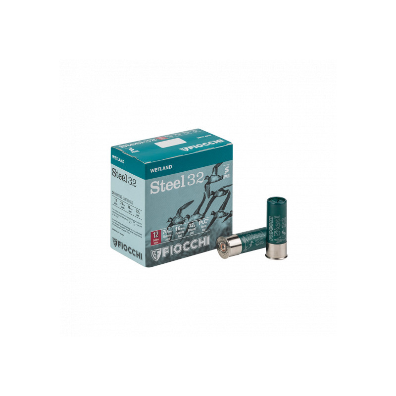 Cartucho Fiocchi STEEL 32 con carga de 32 gramos y calibre 12/70/16. Perdigón de 0-2#7.