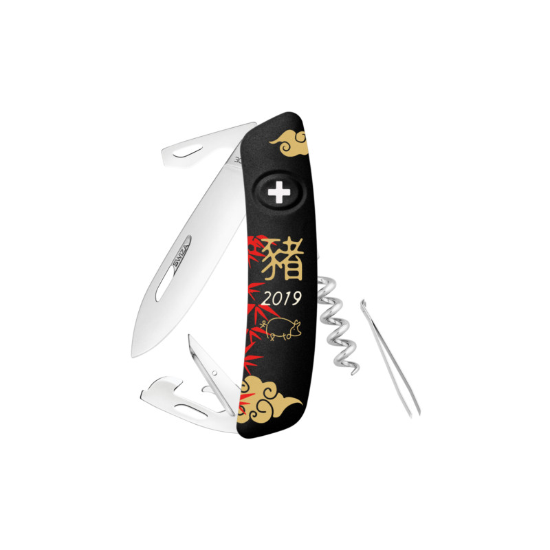 Incorpora un sistema de seguro con tan solo pulsar el botón de la cruz Swiza, que desbloquea la hoja.